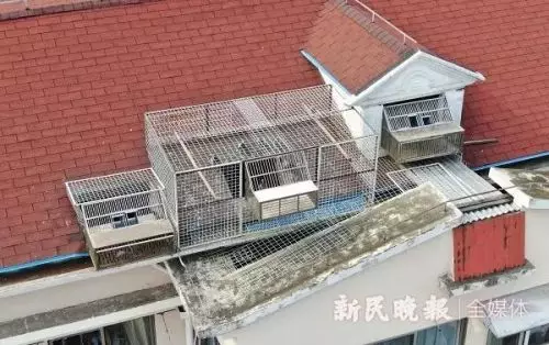 為了一觀房頂全貌,記者試飛無人機。無人機升空後,可以更清楚地看到,在屋頂南側外部,「吊」出了一隻白色的大型鴿棚,5隻鴿子正在裏面悠然自得地散著步。可是,鴿棚就這樣懸在屋頂外,讓人無法心定:且不說鴿子的排泄物等會直接影響周邊環境,一旦颱風來臨,將它吹落,後果不堪設想。