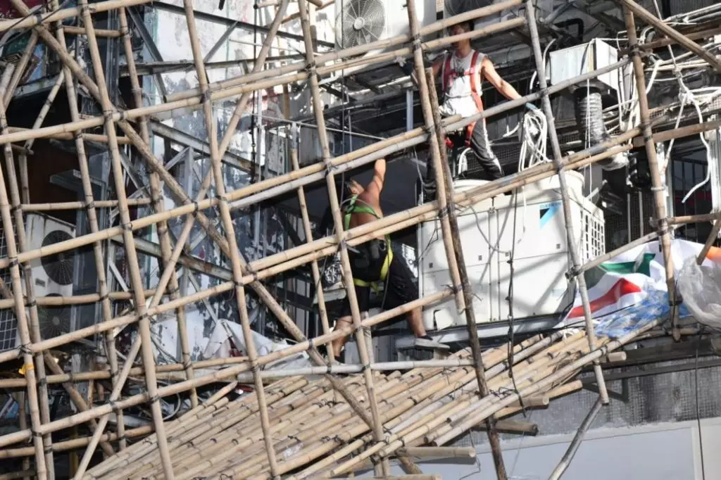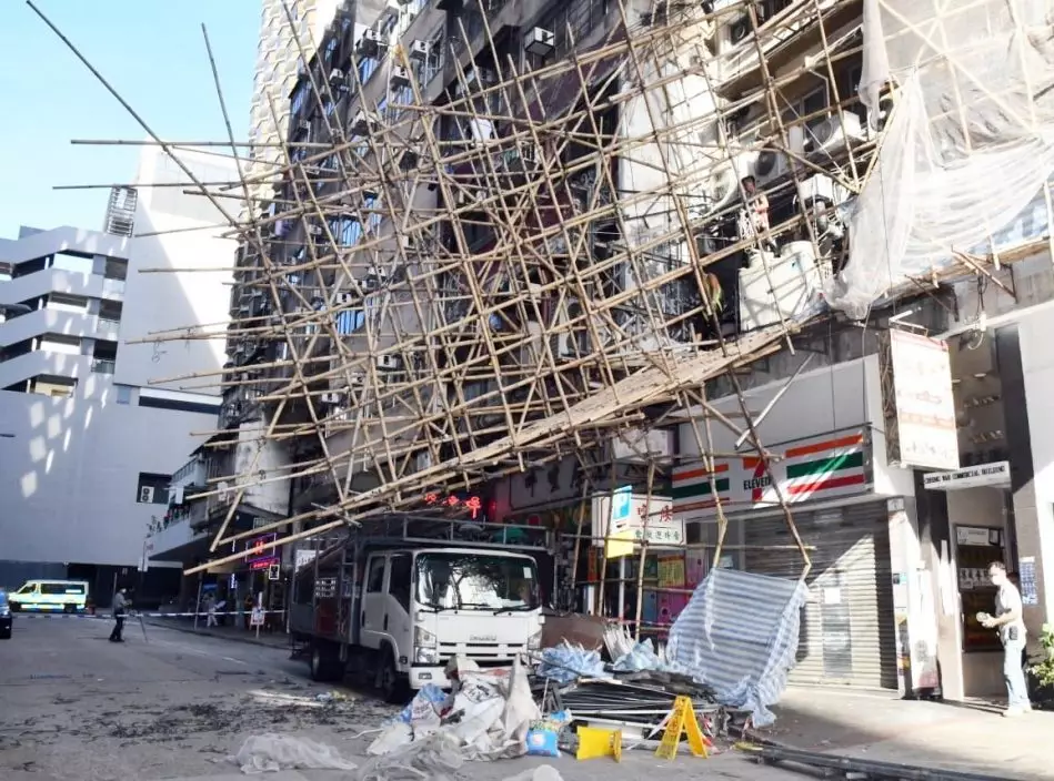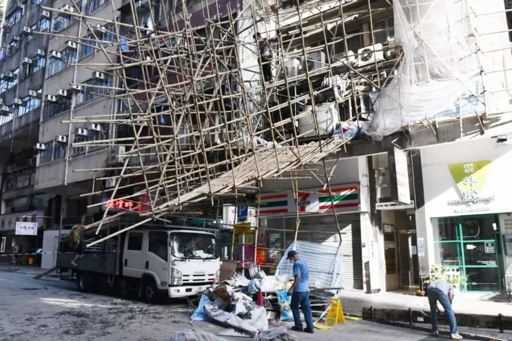 事發在下午近4時,在西貢街3至5號的昌華商業大廈,2樓外牆一幅約高7米、長8米及闊2米竹棚,在拆卸期間突然傾斜,工友隨即報警求助。