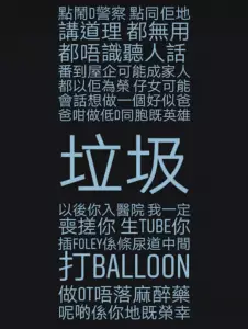 【註釋:「喪搓你」=為你做瘋狂心外壓(急救) ;「生TUBE你」=監生、粗暴插喉管入你的氣管 (協助呼吸);「插FOLEY係條尿道中間打BALLOON」=插導尿管(尿喉) 至尿道中間時就泵氣入導尿管的氣囊內(不插入膀胱);「做OT唔落麻醉藥」= 手術時不給麻醉藥;「呢啲係你地既榮幸」=這些是你們(警察)的榮幸。】