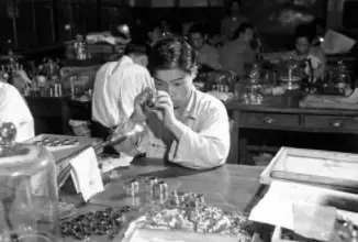 日本女孩正在為人工養殖的珍珠進行數算與分類。1949年10月12日