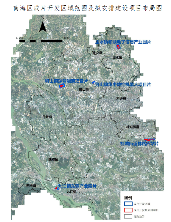 五大成片開發區域,分佈在桂城、九江、獅山、里水,它們分別是: