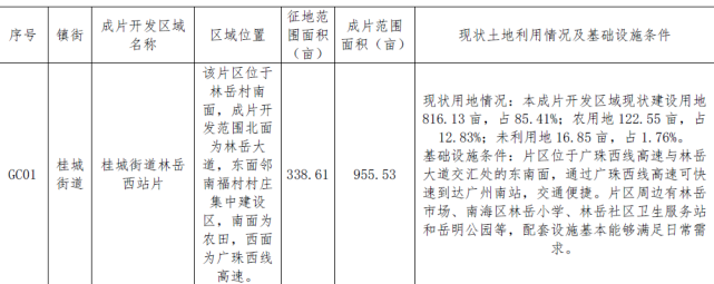 據介紹,片區位於林岳村南面,成片開發範圍北面為林岳大道,東面鄰南福村村莊集中建設區,南面為農田,西面為廣珠西線高速。成片開發範圍955.53畝,征地範圍338.61畝,片區公益性用地比例46.93%。目前,片區現狀為建設用地816.13畝,佔85.41%;農用地122.55畝,佔12.83%;未利用地 16.85 畝,佔1.76%。
