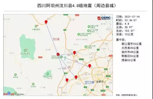 震中距都江堰市26公里、距崇州市48公里、距成都市76公里。