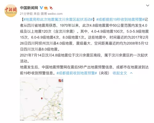 2021年7月14日汶川4.8級地震位於汶川餘震區南段,屬於汶川餘震區的一次起伏活動。