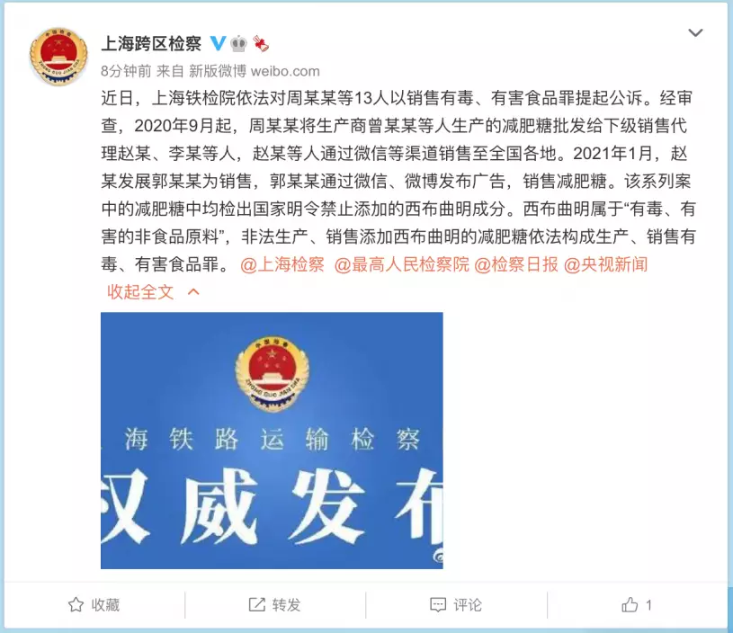 檢方通報,該系列案中的減肥糖中均檢出國家明令禁止添加的西布曲明成分。西布曲明屬於「有毒、有害的非食品原料」,非法生產、銷售添加西布曲明的減肥糖依法構成生產、銷售有毒、有害食品罪。