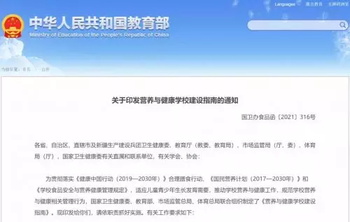 近日,教育部聯合國家衛生健康委等四部門印發《營養與健康學校建設指南》,對適應兒童青少年生長發育需要,推動學校營養與健康工作,規範學校營養與健康相關管理行為作出要求。