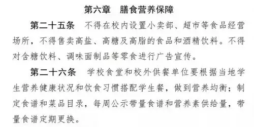 二是食品安全。主要包括學校食堂和校外供餐單位要建立健全食品安全管理制度,學校食堂要實施「明廚亮灶」和分餐制度,建立學校相關負責人陪餐制度和家長陪餐制度等內容。