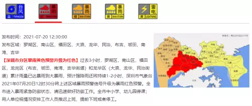 受颱風「查帕卡」影響,過去3小時,羅湖區,南山區,福田區,龍崗區(布吉、坂田、南灣、吉華街道)和龍華區(大浪、龍華、民治街道)累計雨量已達暴雨到大暴雨,預計強降雨還將持續1-2小時,深圳市氣象台7月20日12時30分,將上述區域暴雨預警信號升級為暴雨紅色預警。