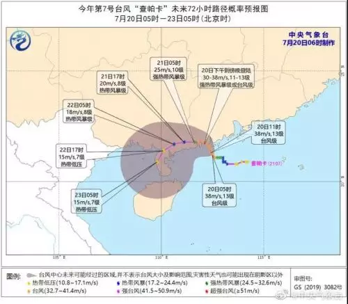 7月20日9時,颱風「查帕卡」(颱風級),中心最大風速38米/秒(13級),其中心位於深圳西南方向約212公里的南海海面上。