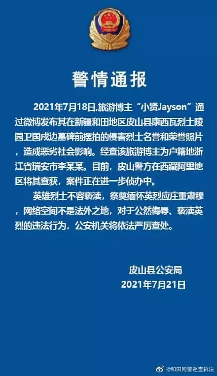 新疆和田網警在微信發通報,指日前在戍邊烈士墓碑前擺拍的旅遊博客博主已被拘捕。通報指,網名「小賢Jayson」,戶籍地浙江省瑞安市的李姓博主,通過微博發布其在新疆和田地區皮山縣康西瓦烈土陵園衛國戍邊墓碑前,擺拍侵害烈土名譽和榮譽照片,造成惡劣社會影響。皮山警方在西藏阿里地區將其拘捕,案件正在進一步偵辦中。