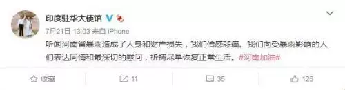 印度駐華大使館表示,「聽聞河南省暴雨造成了人身和財產損失,我們倍感悲痛。我們向受暴雨影響的人們表達同情和最深切的慰問,祈禱儘早恢復正常生活。」