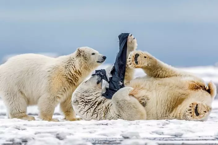 攝影師話呢隻雌性北極熊喺冰原上發現一條雪到硬崩崩嘅長褲,兩隻手拎住左揈右揈玩咗好耐,曾試過用雙腳撐開,似乎想穿上,認真醒目!無奈佢Pat Pat實在太大,着唔到唯有放棄。北極熊搞笑舉動仲吸引咗佢同伴過嚟,一齊研究研究。