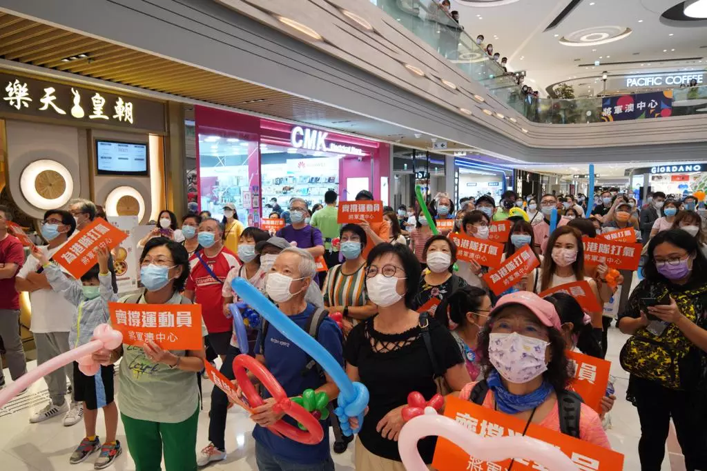 近百市民齊集將軍澳中心中庭收看奧運賽事直播,為港隊代表李慧詩吶喊助威。