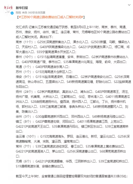 記者從江蘇省交通運輸廳獲悉,截至8月6日上午11時,南京、泰州、南通、蘇州、淮安、揚州、徐州、鎮江、連雲港、常州、無錫等地區90個高速公路收費站出口或入口暫時關閉。具體如下:
