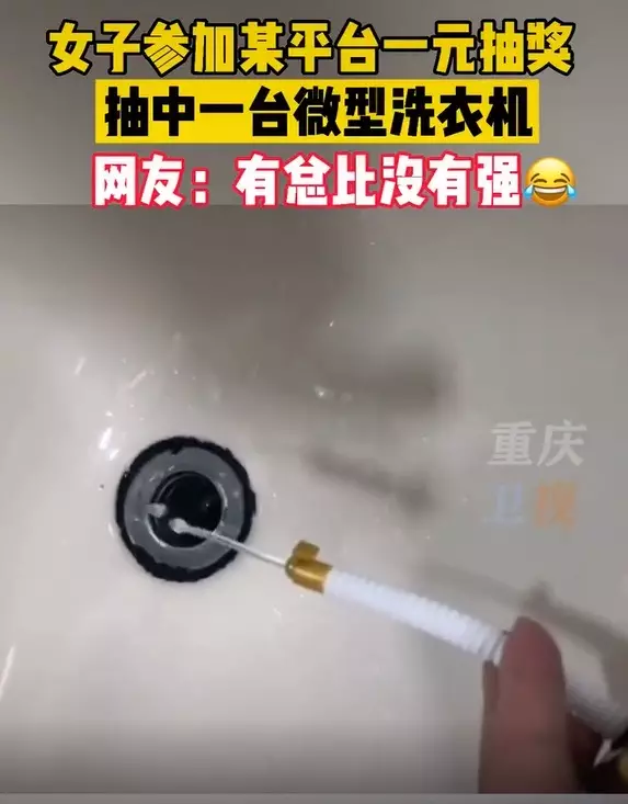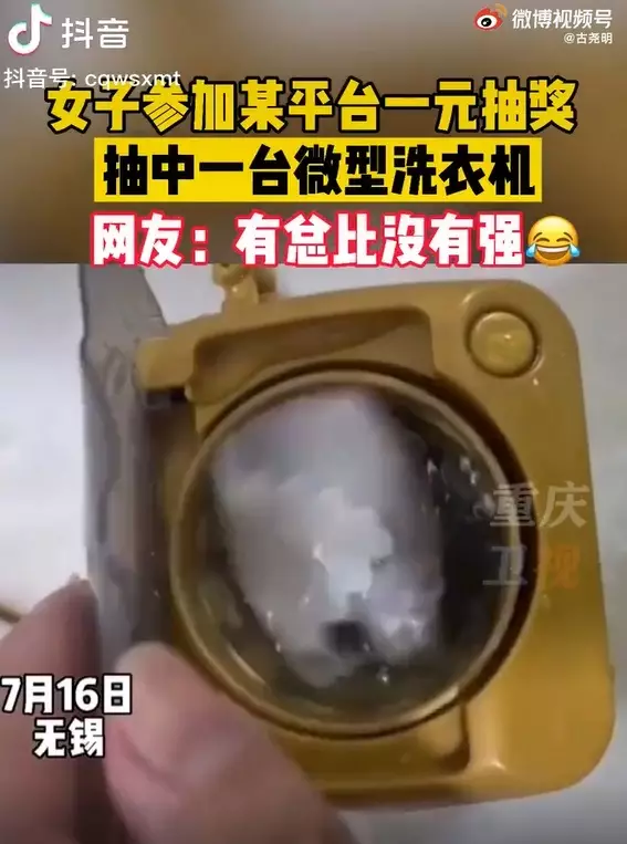 網售的商品貨不對板是經常出現的事。最近內地江蘇有一名主婦在網購平台參加「1元(人民幣)」的抽獎活動,幸運抽到一部「洗衣機」,怎料收到快遞開箱後卻大吃一驚,原來這部洗衣機竟只有手掌大小。