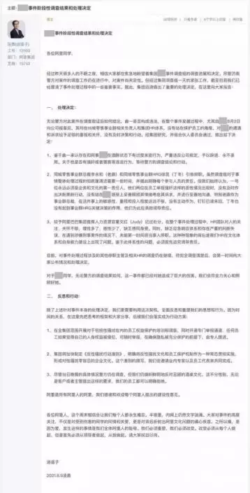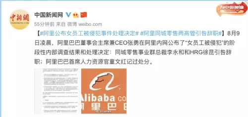 8月9日凌晨,阿里巴巴董事會主席兼CEO張勇在阿里內網公佈了「女員工被侵犯」的階段性內部調查結果和處理決定。