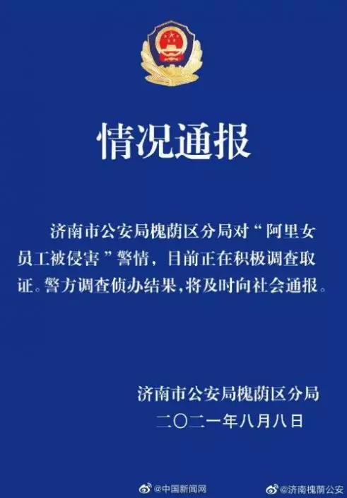 此前,@濟南槐蔭公安 發佈情況通報:濟南市公安局槐蔭區分局對「阿里女員工被侵害」警情,目前正在積極調查取證。警方調查偵辦結果,將及時向社會通報。