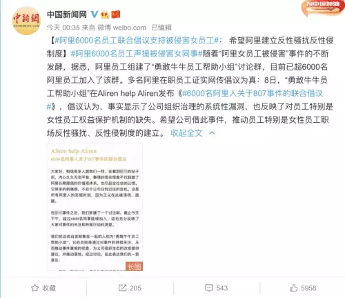 8日,「勇敢牛牛員工幫助小組」在Aliren help Aliren發佈《#6000名阿里人關於807事件的聯合倡議#》,倡議認為,事實顯示了公司組織治理的系統性漏洞,也反映了對員工特別是女性員工權益保護機制的缺失。希望公司藉此事件,推動員工特別是女性員工職場反性騷擾、反性侵制度的建立。