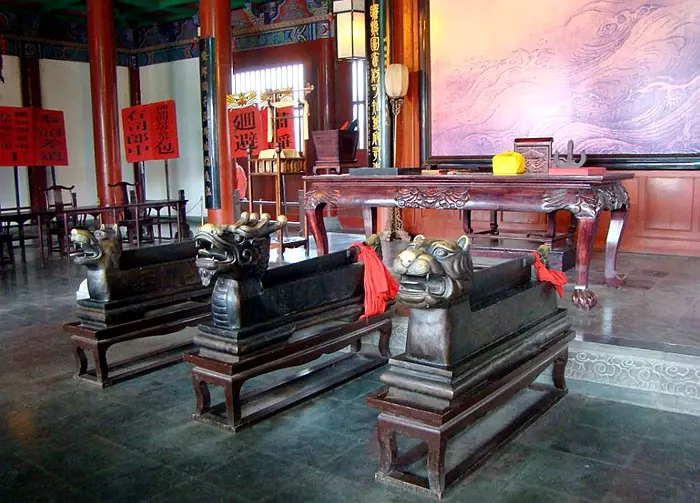 開封市包公祠中陳列着的「御札三道」——狗頭鍘、龍頭鍘、虎頭鍘。鍘刀在元代才出現,最初的用途是鍘草,後來元雜劇裏的包公才開始與鍘刀「結緣」,而包拯所用的狗頭鍘、虎頭鍘和龍頭鍘則是出自《三俠五義》。(網上圖片)