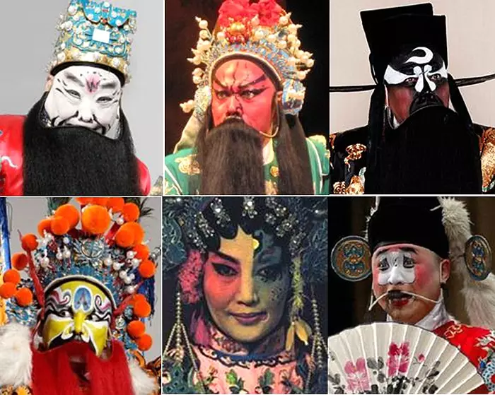 戲曲面譜還有綠、藍、黃、粉紅、灰、青等色。除此之外,面譜還有五色面(用五種或以上的顏色畫成,象徵超凡出世的人物,角色多以妖魔鬼怪、神仙為主)、陰陽面(即在面部兩邊勾畫不同顏色,這種面譜因應劇情內容而出現,如鍾無艷)、豆腐潤(即演員在臉中鼻眼之間畫一小方塊白色,形狀似豆腐,是扮演愚蠢或滑稽角色的專用面譜)。(網上圖片)