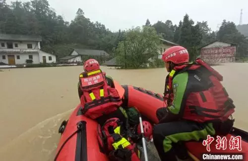 達州大竹縣楊家鎮,消防員用衝鋒舟營救和轉移被困民眾。圖:中新網