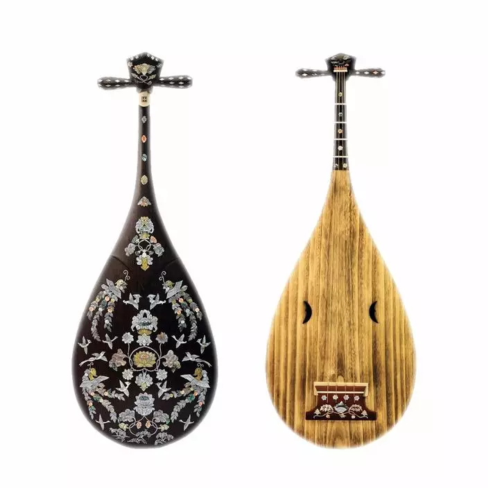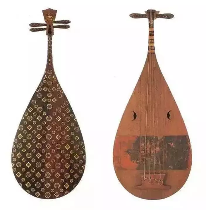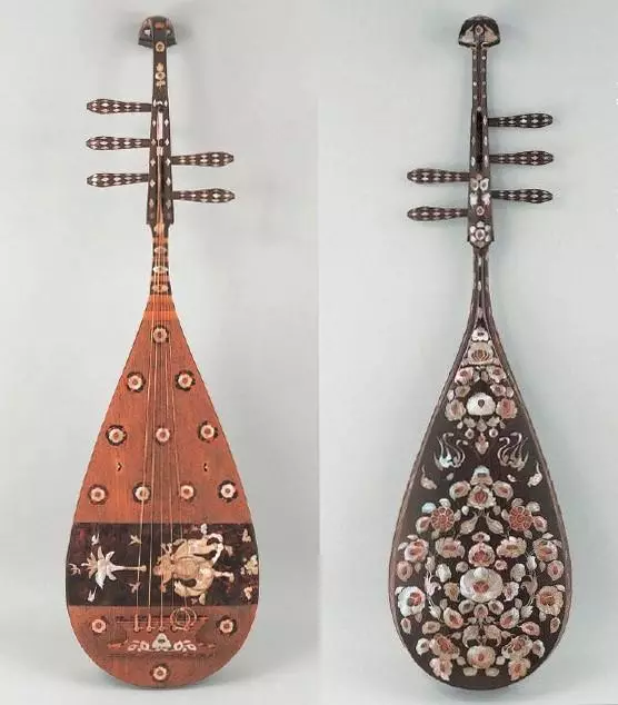 螺鈿紫檀五弦琵琶,左右分別為正面和反面。 (網上圖片)