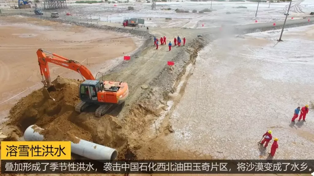 據內媒報道,7月中下旬,位於塔克拉瑪干沙漠的中國石化西北油田玉奇片區遭洪水襲擊,淹水面積廣達300多平方公里,油區道路多處衝堤潰壩、電線杆傾斜,近50輛勘探車輛、3萬套設備被淹。