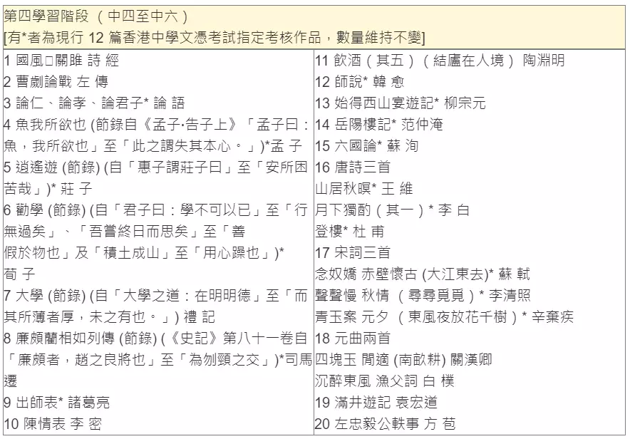 教育局發布中學和小學中國語文課程的建議篇章編目。除中一至中三的25篇外,其餘均為20篇。當中,建議小一至小三學生可讀韓非子的《守株待兔》、曹植《七步詩》、李白《靜夜思》等作品。小四至小六,可以讀《戰國策》的《鷸蚌相爭》、李白《早發白帝城》等。