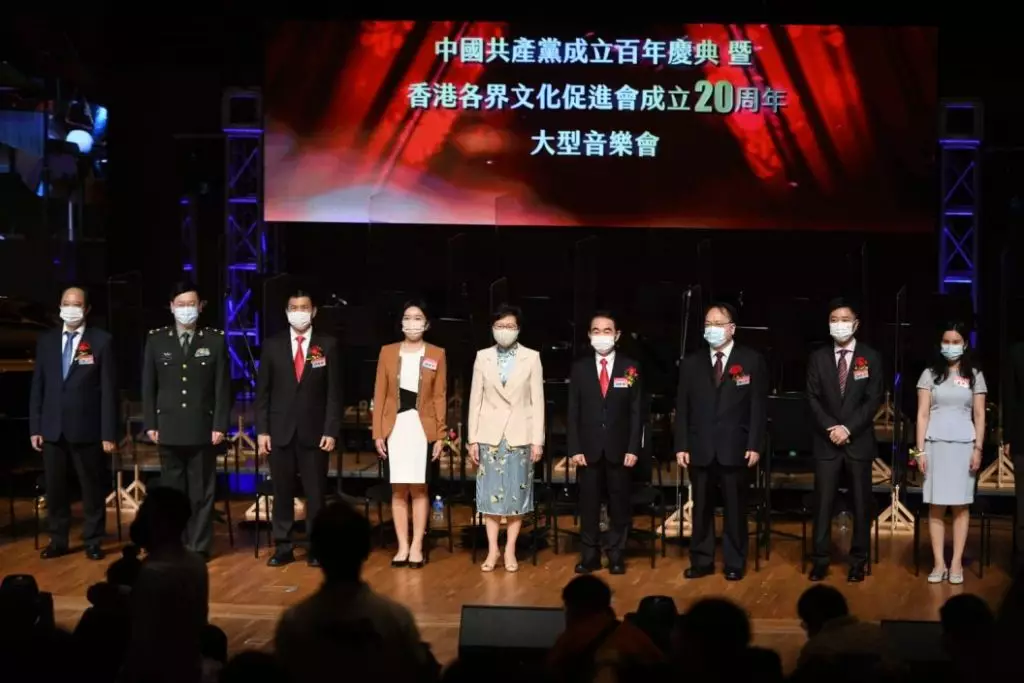 特首林鄭月娥致詞時指共產黨至今已成為世界上規模最大的執政黨,國家在經濟、社會、文化、科技等領域取得輝煌成就,人民生活水平及國際地位亦顯著上升,令全世界中國人感到無比自豪。