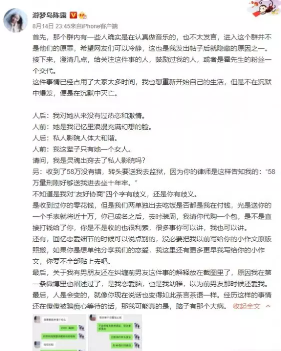 不過,她表示拍拖以來雙方都有付出金錢,而非單方面,她續寫着:「是收到過你的零花錢,但是我們兩單獨出去吃飯是否都是我在付錢,光是送你的一個手表就將近十萬,你已成名之後,去時裝周,我請你代購一個包,是不是直接打錢给了你,你是不是收的也很利索,很多事你可以講,我也可以講。」網民對事件議論紛紛,有人認為霍尊確實是個渣男,但亦有人覺得陳露也絕不簡單。