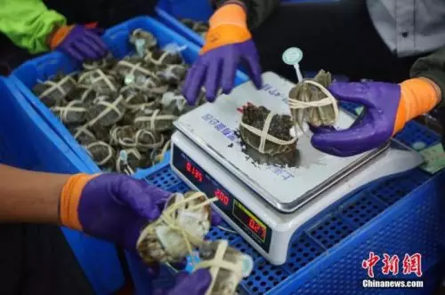 資料圖:蘇州市相城區陽澄湖大閘蟹養殖基地內,技術熟練的工人正在給螃蟹稱重。中新社記者 泱波 攝