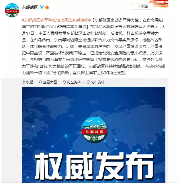第三,「8月17日」。看到東部戰區新聞稿時,對8月17日這個時間第一反應是:這是說17日當天進行了一次戰區內相關艦機部隊快進快出的聯合火力突擊實兵演練呢?還是說,將要從17日開始要進行一系列的「聯合火力突擊等實兵演練」?甚至潛台詞是,「我把話先撂在這裡了,相關當事方你們掂量著辦吧,如果識相有所收斂,那可能就是一次聯合突擊演練,如果還不收斂,那就多搞幾次,直到被點名的相關方充分接收到這份警告資訊為止。」