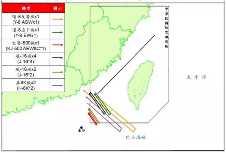 從台方發佈的當天解放軍進入臺灣周邊西南空域活動的航線示意圖來看,似乎運-8等特種機型、空警-500預警機、殲-16戰機、轟-6K轟炸機的活動區域在西南方向,那如果後續還會搞一個系列突擊演練的話,是否會到東南方向繞飛。大家可以拭目以待。