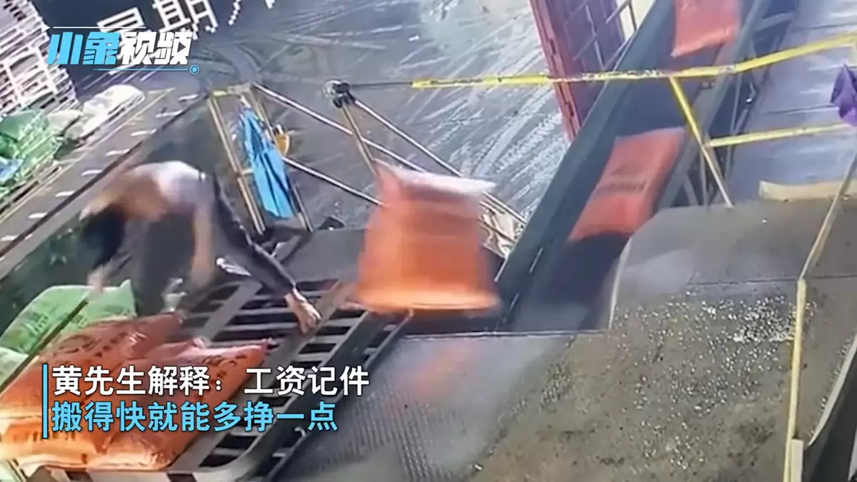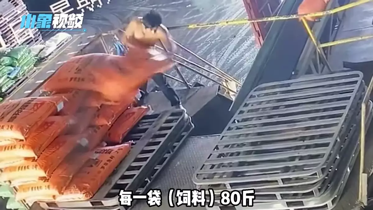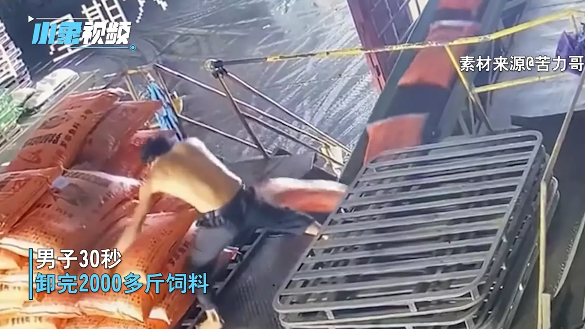 據內地媒體報道,日前一段搬運工快速卸飼料的影片在網上流傳,當中一男子光著膀子站在板車上,將沉甸甸的袋裝飼料逐一甩到一旁的傳送帶上,一秒一袋,在短短30秒內就卸完一整板車飼料。