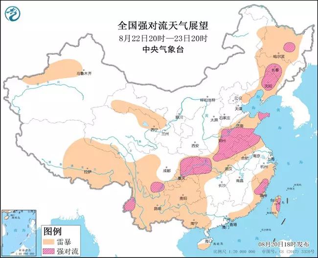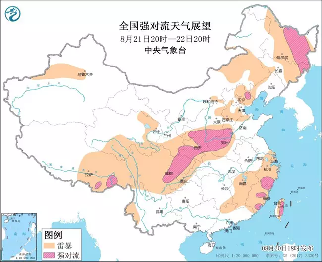 預計,8月21日08時至22日08時,四川盆地北部、陝西中南部、甘肅東南部、山西南部、河南西北部以及黑龍江中部和東南部、吉林東部、遼寧東部等地的部分地區有大到暴雨,其中,吉林東北部、陝西中部等地局地有大暴雨(100~120毫米)。上述部分地區伴有短時強降水(最大小時降雨量20~50毫米,局地可超過70毫米),局地有雷暴大風等強對流天氣。