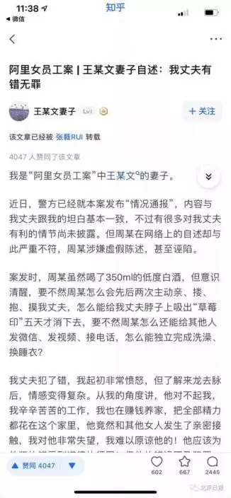 該事件中王某文的妻子在知乎平台註冊賬號,並於8月23日發文稱周某涉嫌虛假陳述,甚至誣陷。她對其丈夫涉嫌「強制猥褻」一說,提出五點疑問(以下為原文摘要):