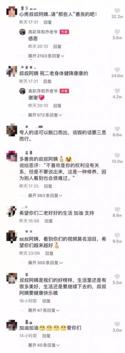 有人說,希望你們越來越好。有人祝願兩位老人身體健康。還有網友回懟「惡評」,夸人的話可以脫口而出,詆毀的話要三思而行。「不喜歡是你的權利沒有關係,但是不要說出來,這是一種修養,因為別人看到也會很難過。」