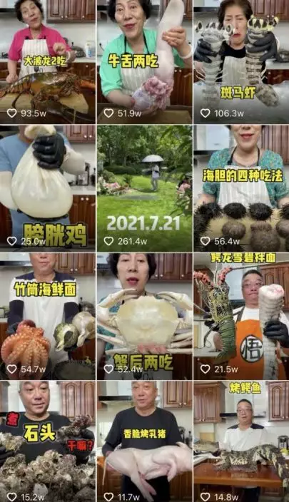 在短視頻平台可以看到,喬任梁的父母以「高彩萍和喬老爺」這一賬號分享生活日常,其中多是美食視頻,如土耳其烤肉、椰子蟹、烤乳豬等等,食材五花八門。