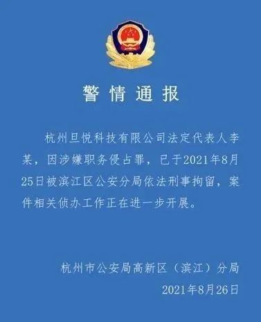 8月26日,杭州市公安局濱江區分局微信公眾號發佈警情通報稱,杭州旦悅科技有限公司法定代表人李某(蘭迪少兒英語、ABC360英語創始人李晶),因涉嫌職務侵占罪,已於2021年8月25日被濱江區公安分局依法刑事拘留,案件相關偵辦工作正在進一步開展。.