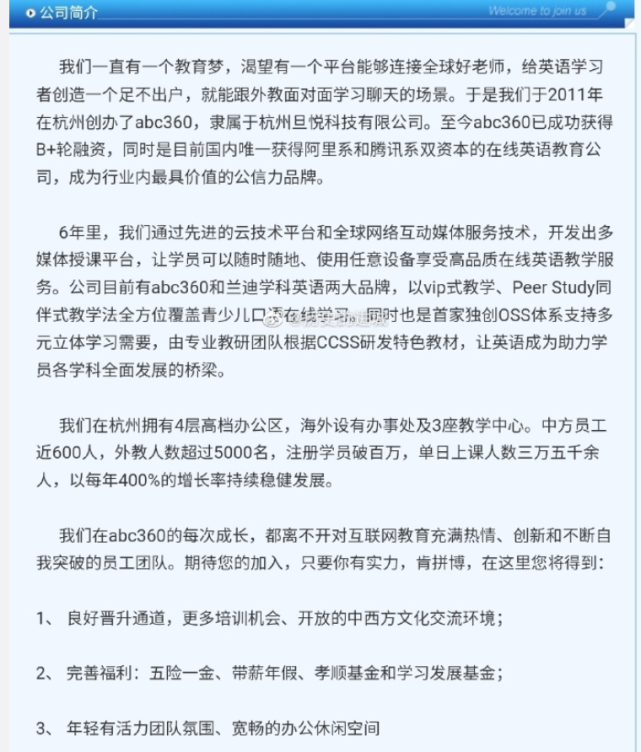 其官網介紹稱,於2011年創辦了abc360,於2017年創辦了蘭迪少兒英語。深耕八年,至今已成功獲得C輪融資,同時也是目前國內唯一獲得阿里系和騰訊系雙資本的在線英語教育公司,成為行業內最具價值的公信力品牌。