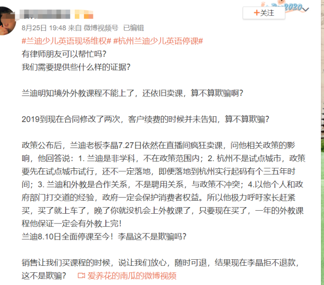 有不少用戶在微博發帖投訴稱,政策公佈後,蘭迪老闆李晶7.27日依然在直播間瘋狂賣課,問他相關政策的影響,他極力呼籲家長趕緊買,買了就上車了,晚了就沒機會上外教課了,結果蘭迪8.10日全面停課至今!用戶稱,銷售讓買課程的時候,說放心,隨時可退,結果現在李晶拒不退款,這不是欺騙?
