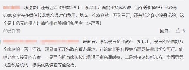 也有用戶稱,李晶單方面提出換成AI課,已經有5000多家長在微信接龍剩餘課時和費用,基本一個家庭就一萬到三萬,還有那麼多少沒登記的,這個是上億元的侵佔!