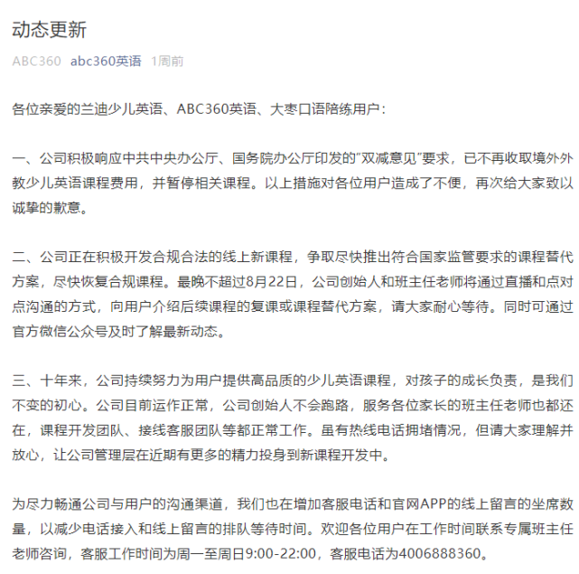 杭州ABC360在線英語培訓在8月12日發佈的最新公告中稱,將在8月22日前給出合規的課程方案,但並未提及退款安排。有家長表示,工作人員回應稱退費需要排隊,「具體時長無法給出。」