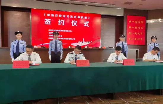 在發佈會上,市公安局經偵總隊與北京銀保監局、北京保險行業協會、中國銀保信公司共同簽署了《保險反欺詐交流會商機制》。