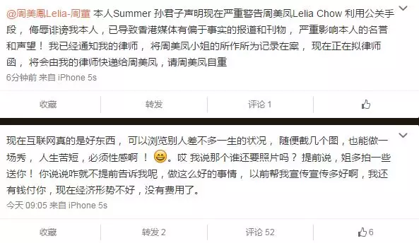 Summer今日再於微博發功,先是寸爆周美鳳的行為是幫自己做騷:「現在互聯網真的是好東西, 可以瀏覽別人差不多一生的狀況,隨便截幾個圖,也能做一場秀,人生苦短,必須性感啊!哎 我說那個誰還要照片嗎?提前說,姐多拍一些送你!你說說咋就不提前告訴我呢,做這麼好的事情,以前幫我宣傳宣傳多好啊,我還有錢付你,現在經濟形勢不好,沒有費用了。」