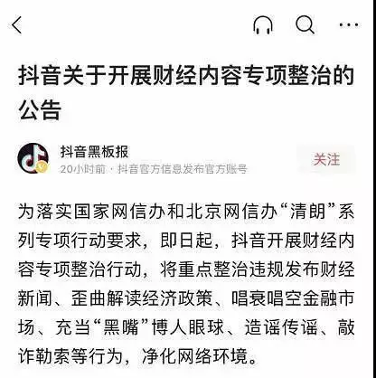 抖音表示,為落實國家網信辦和北京網信辦「清朗」系列專項行動要求,即日起,抖音開展財經內容專項整治行動,將重點整治違規發佈財經新聞、歪曲解讀經濟政策、唱衰唱空金融市場、充當「黑嘴」博人眼球、造謠傳謠、敲詐勒索等行為,凈化網路環境。