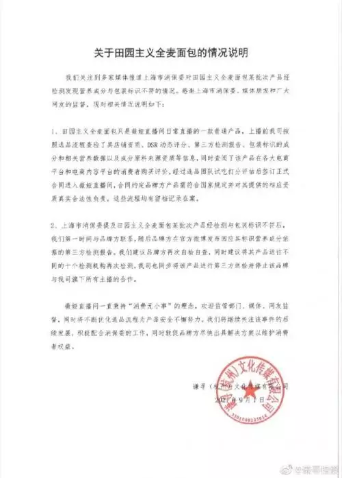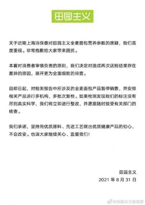 回應中表示,田園主義產品標準符合併遵守《食品安全國家標準 預包裝食品營養標籤通則》的相關法規(GB28050-2011), 產品檢測報告由河南百信達檢測技術有限公司出具,檢測產品包括:低脂全麥歐包(原味、抹茶紅豆味、紫薯紅提味、南瓜蔓越莓味、黑芝麻核桃味),並以此為依據進行了包裝標識。還附上了進口小麥品質證書、入境貨物檢驗檢疫證書。
