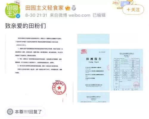8月31日,田園主義官方微博表示「非常抱歉給大家帶來困擾」,並回應稱: