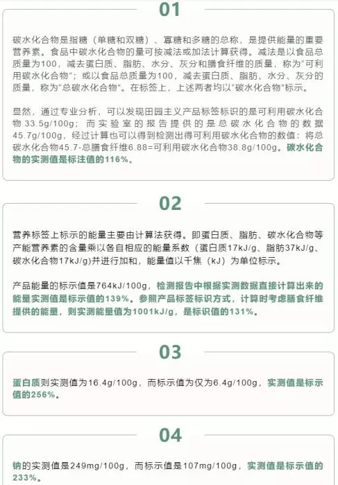 通過專業分析,可以發現田園主義產品標籤標識的是可利用碳水化合物33.5g/100g;而實驗室的報告提供的是總碳水化合物的數據45.7g/100g,經過計算也可以得到檢測出的可利用碳水化合物的數值是38.8g/100g。碳水化合物的實測值是標註值的116%。