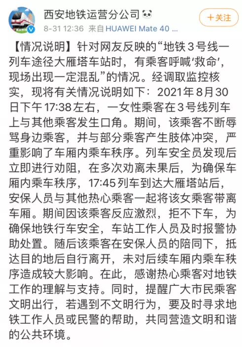 昨天中午12時36分,西安地鐵運營分公司在其官方微博發佈情況說明稱,經調取監控核實,8月30日17時38分許,一女性乘客在3號線列車上與其他乘客發生口角。「期間,該乘客不斷辱罵身邊乘客,並與部分乘客產生肢體衝突,嚴重影響了車廂內乘車秩序。列車安全員發現後立即進行勸阻,在多次勸離未果後,為確保車廂內乘車秩序,17時45分列車到達大雁塔站後,安保人員與其他熱心乘客一起將該女乘客帶離車廂。」